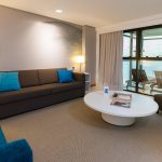 O ambiente de estar, também chamado de Day Office, tem acesso ao corredor exclusivo e pode ser separado da área do quarto com portas comunicantes. Pode ser feita a liberação de early check-in ou late check-out conforme disponibilidade do hotel. É equipado com TV de LED à cabo, ar condicionado tipo split, ferro e tábua de passar e máquina de café expresso. O café da manhã pode ser servido no apartamento à critério do hóspede. O hóspede tem direito uma peça de roupa lavada e passada por dia. Ebulidor e bandeja com sachês de café, chá e cappuccino. Serviço de Express Check-out.
