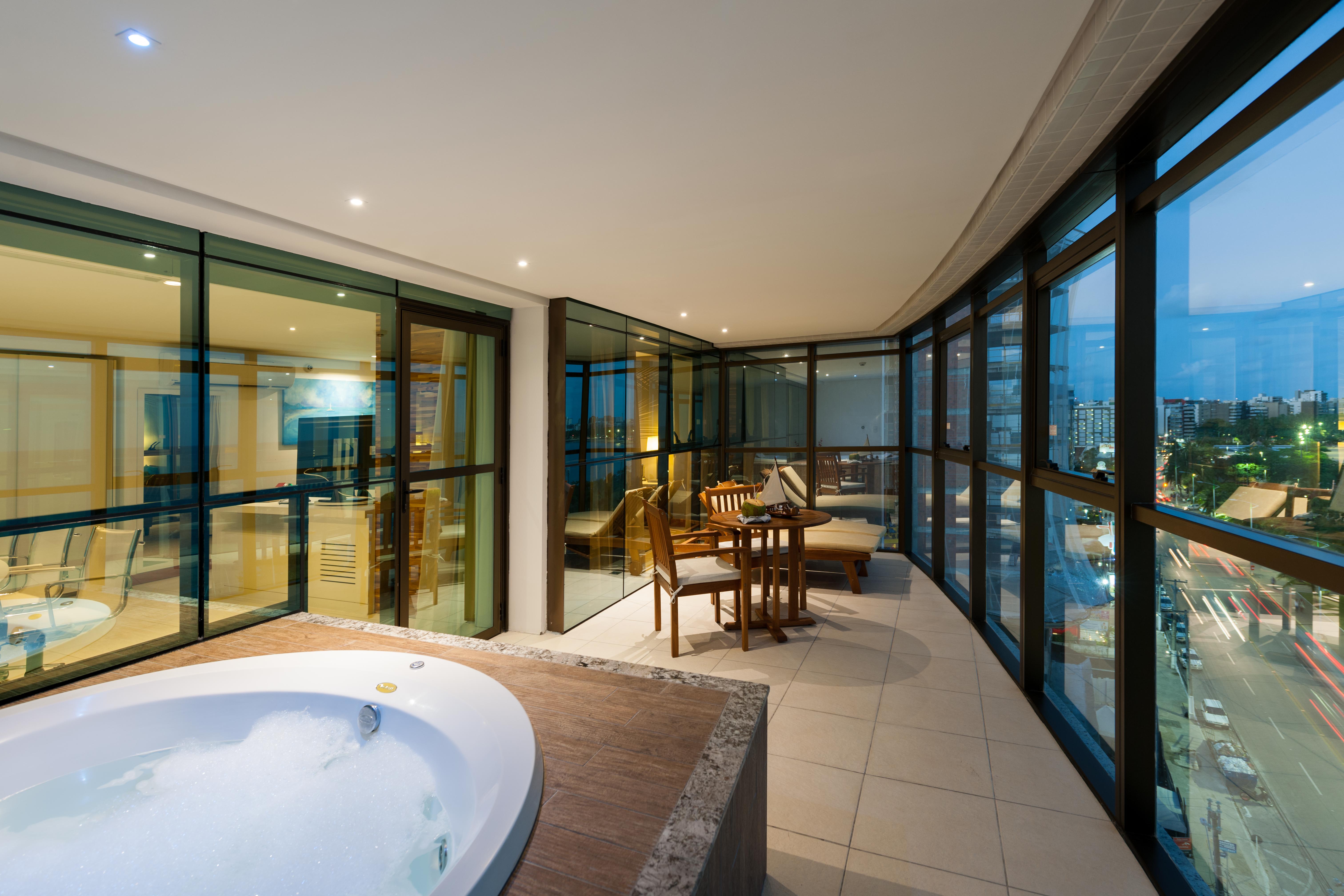 Única, exclusiva e elegante. Localizada no 7º andar, tem uma incrível vista para a Praia de Pajuçara, possui aproximadamente 127 m² projetados com todo o cuidado oferecendo serviços completos e distribuída em vários ambientes como quarto, sala de estar, sala de jantar e/ou reuniões, closet, varanda com hidromassagem para duas pessoas, mesa, espreguiçadeira, dois banheiros sendo um exclusivo para a área do quarto com banheira individual de hidromassagem e bancada dupla, e outro na área de estar. Possui uma exclusiva cama com montagem especial, roupão de piquet e pantufa para uso no hotel e balança digital.